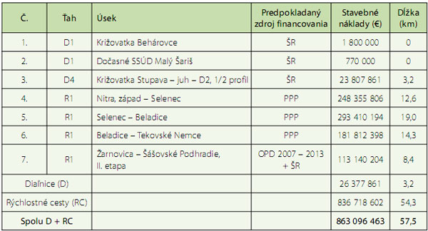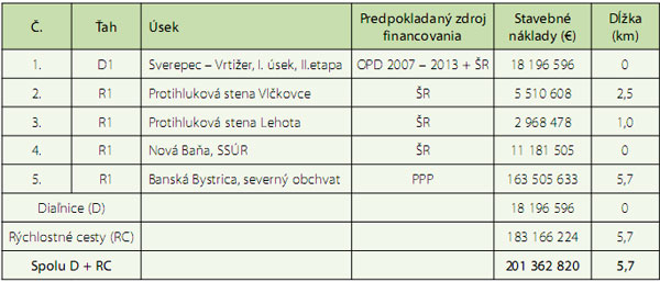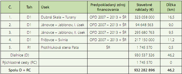 ** Úseky č. 6, 7 a 9 – 12 sú v nízkom štádiu prípravy, zabezpečenie pripravenosti výstavby od roku 2014 vrátane výkupov pozemkov nemožno garantovať (je možný posun začatia na rok 2015).