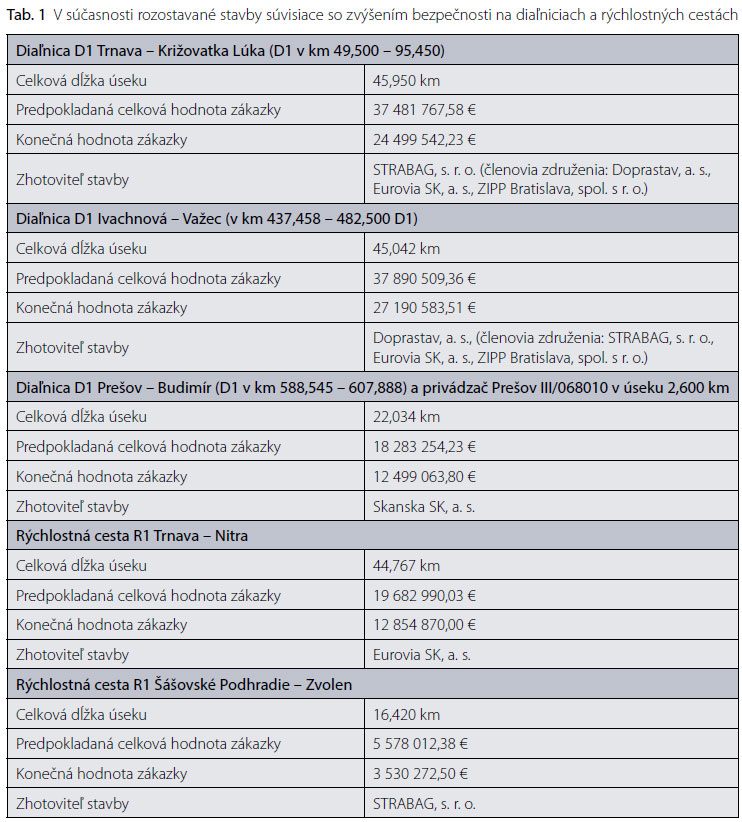 V súčasnosti je rozostavaných 5 stavieb súvisiacich so zvýšením bezpečnosti na diaľniciach a rýchlostných cestách – ide o úseky diaľnic a rýchlostných ciest uvedené v tab. 1.