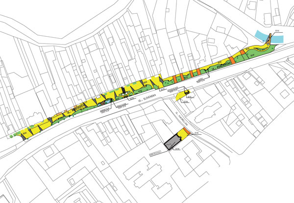 Celková situácia – regenerácia verejného priestoru centra Hanušoviec nad Topľou zahŕňa aj revitalizáciu zelene, rekonštrukciu spevnených plôch, osvetlenia a lávky pre peších, ako aj doplnenie prvkov drobnej architektúry.