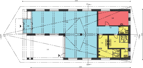 Pôdorys prízemia – modrú plochu tvorí čakáreň pre cestujúcich, červená je zázemie pre personál a žltá sú hygienické priestory.