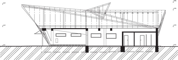 Rez objektom – jednoduchá hmota prízemia je v kontraste s konštrukciou strechy.