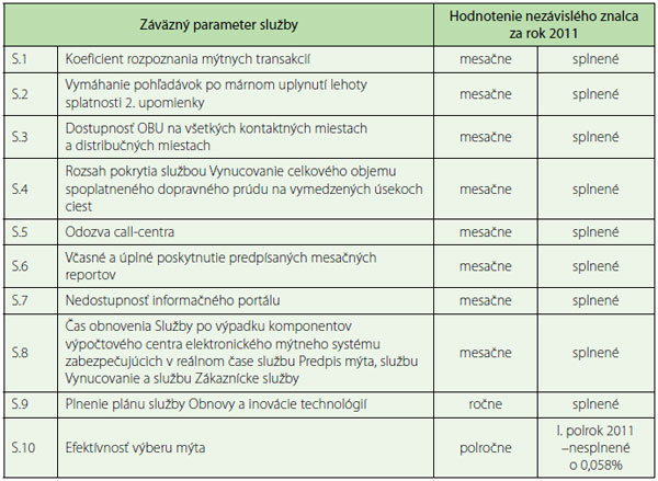 Funkčné požiadavky na čiastkové služby, technické požiadavky na elektronický mýtny systém a ostatné podmienky vyplývajúce zo zmluvy hodnotí NDS ako objednávateľ služby a zároveň správca výberu mýta. NDS môže ku kontrolám prizvať aj nezávislého znalca ako nestrannú osobu. Plnenie jednotlivých požiadaviek a zmluvných podmienok sa hodnotí priebežne, a to vzhľadom na to, že ide o veľké množstvo požiadaviek, ktoré treba vyhodnotiť. Počas roka 2011 sa v uvedených čiastkových službách nezistili nijaké nedostatky, ktoré by mali zásadný alebo významný vplyv na zabezpečovanie služby v požadovanej kvalite a rozsahu a v konečnom dôsledku by teda mohli mať aj negatívny vplyv na výšku výberu mýta.