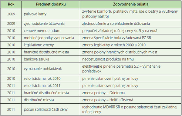 Tab. 4 Platné dodatky Zmluvy o poskytovaní komplexnej služby elektronického výberu mýta