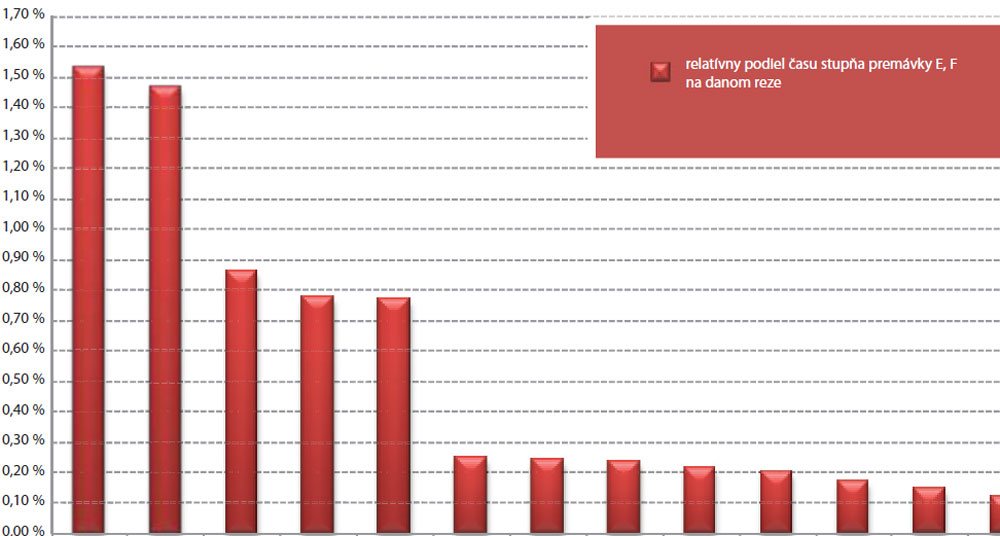 Obr. 3 Relatívny podiel času stupňa premávky E, F na danom reze za obdobie jún 2011 až jún 2012