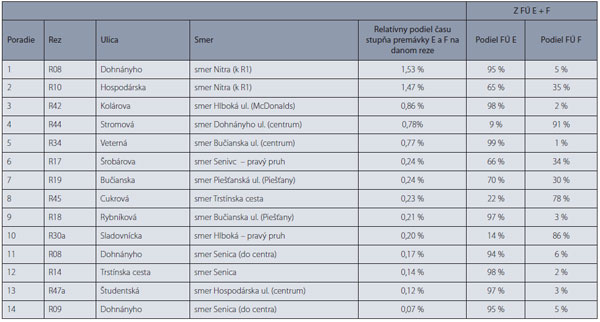 Z tabuľky a obr. 2 a 3 sú zrejmé najproblémovejšie miesta, ktoré sú logicky priamo alebo v blízkosti komunikácií obchádzajúcich neprejazdné centrum mesta a prenášajúce aj značný podiel tranzitnej dopravy. Z pomeru medzi relatívnou dĺžkou prevádzky na FÚ E a F možno vyčítať ďalšie indície nastavenia siete a jej úzkych hrdiel. Výstupy ukazujú aj charakteristické eskalovanie problému na hlavnej komunikačnej sieti na priľahlé vedľajšie komunikácie.