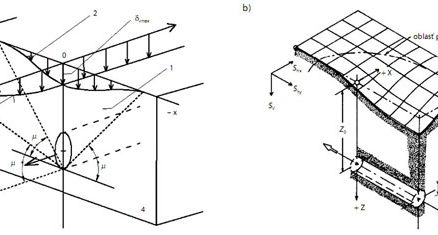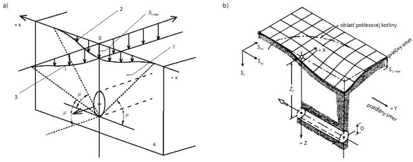 a) deformačné krivky; 1– deformačná zóna, 2 – priečna poklesová kotlina, 3 – pozdĺžna poklesová kotlina, 4 – rovina čela
