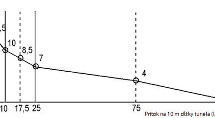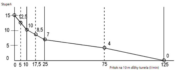Otvorením výrubu [1] sa vytvoria podmienky na prítok podzemnej vody do tunela, čo má vplyv nielen na jeho stabilitu. Vzniká drenážny efekt, ktorý vyvolá zníženie hladiny podzemnej vody. Zníži sa vztlak na zemné častice, a tým sa zväčší efektívne napätie v zemine. V dôsledku tohto priťaženia dochádza k deformáciám horninového masívu zasahujúcim širšiu oblasť (nielen oblasť nad podzemným dielom). Toto sadnutie je nerovnomerné, vyplýva zo všeobecného charakteru depresnej krivky hladiny podzemnej vody. Pri súdržných zeminách treba brať do úvahy objemové zmeny spôsobené konsolidáciou. Hydrogeologický prieskum je zameraný na kolísanie hladiny podzemnej vody, prúdenie a zhodnotenie prítokov podzemnej vody do tunela. Na obr. 4 sú uvedené hodnoty parametra, ktorý do klasifikácie RMR [5] zahŕňa vplyv podzemnej vody.
