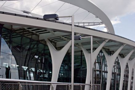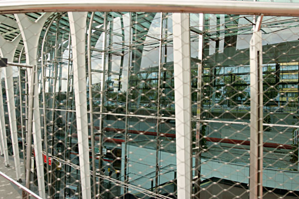 Strešný plášť je z väčšej časti presklený a sklenené tabule fasády tónované do jemne zelenej farby spájajú tzv. spidery: kríže z nehrdzavejúcej ocele (podobajú sa pavúčím nohám), ktoré kotvia rohy sklenených dosiek.