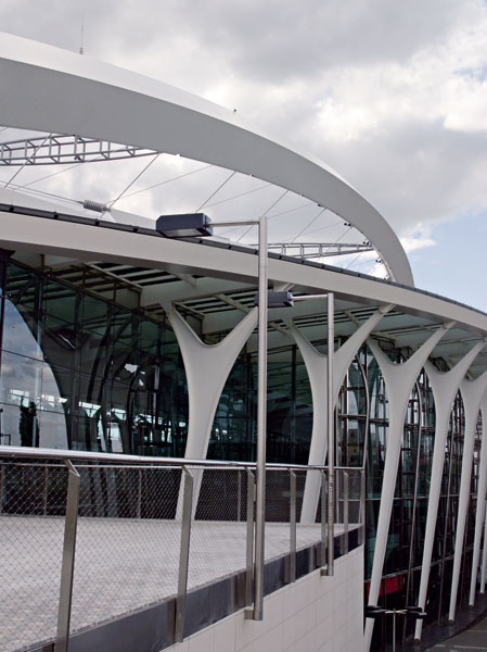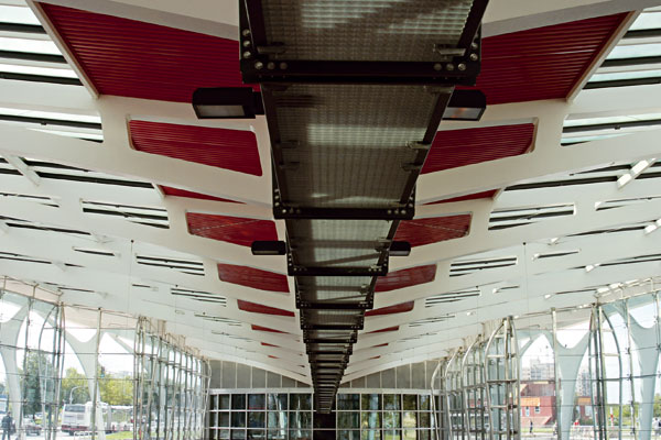 Tvar strechy kopíruje elipsovitý pôdorys celej stanice. Okraje strechy ešte podopierajú rozovierajúce sa biele oceľové profily v tvare ypsilon. Tie môžu z určitého pohľadu pripomínať kostice veľrybej papule. Pri pohľade z vnútra haly z lávky pod chrbticou strechy zasa môžu predstavovať rebrá. Cestujúci si tým pádom pripadá ako v bruchu morského cicavca.