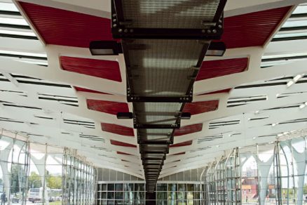 Lávky pokrýva špeciálny hrubý povrchom safetrack duomis. Ten sa využíva napríklad na cyklotrasy alebo na vozovkách. Ak nepočítame farebné tónovanie skla, po bielej je to druhá farba, cielene a pritom decentne použitá na oživenie halového priestoru. „Samozrejme, zvolil som červenú na identifikáciu trasy metra C. Nechcel som, aby stanica hýrila farbami. Chcel som iba dominantnú bielu, nič viac.“ Červeno svietia aj rampové nosiče s osvetlením nad nástupišťami, ktoré tvoria spolu s oceľovou lávkou pod strechou haly výrazné horizontálne línie. Aj tieto svetelné rampy visia na oceľových lanách a nenarušujú vzdušný priestor haly.