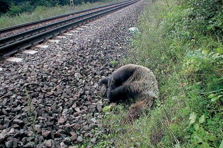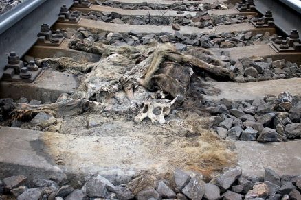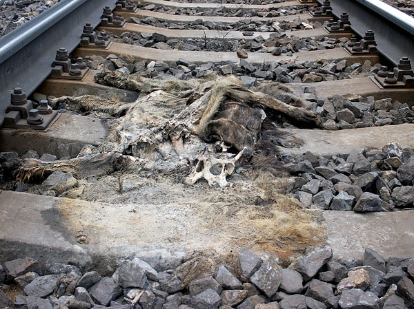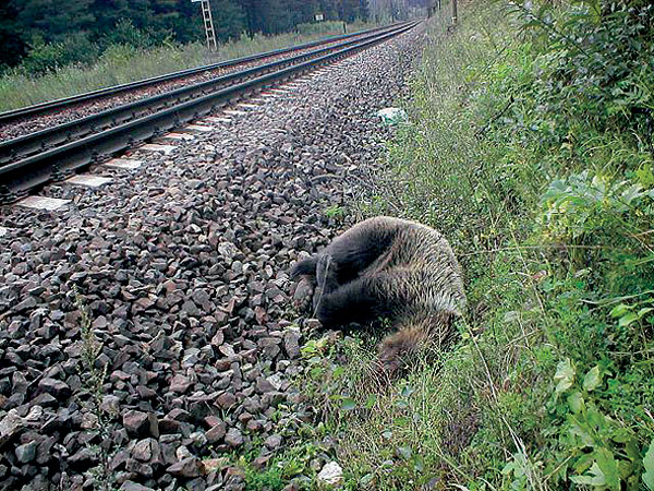 | Železničná trať je neraz miesto, kde uhynú aj chránené druhy živočíchov. Vľavo zrazený medveď a vpravo pozostatky vlka v koľajisku nájdené pri obhliadke v lokalite Rígeľ | |