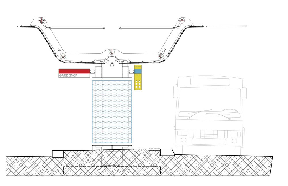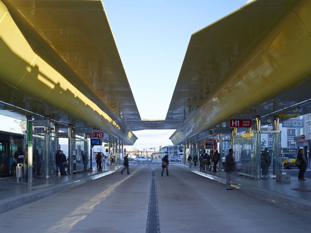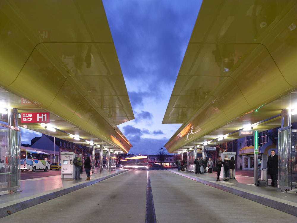Podľa pôvodného plánu mala byť plocha autobusovej stanice vydláždená žulou, nakoniec dostali prednosť trvanlivé betónové dosky, ktoré výrazne odľahčili rozpočet. Vďaka tomu bolo možné vybudovať dva dlhé paralelné prístrešky, ktoré vzhľadom na svoju farebnosť a výšku fungujú ako výborný orientačný bod, ale zároveň poskytujú cestujúcim ochranu pred poveternostnými vplyvmi. Pomáha pri tom aj čiastočné zasklenie nástupíšť, ktoré chráni cestujúcich hlavne pred silným vetrom z pobrežia Atlantiku. Súčasťou projektu sú aj parkovacie stojany na bicykle, lavičky, informačné obrazovky a stĺpy verejného osvetlenia.