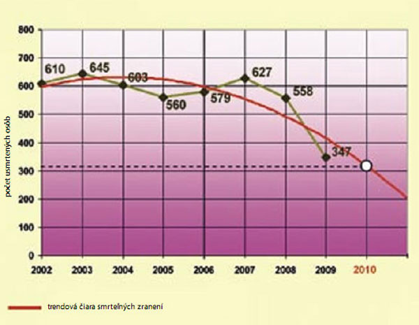 Svoju snahu deklarovali štáty EÚ v Bielej knihe Európska dopravná politika do roku 2010: čas rozhodnutia (2001), v Európskom akčnom programe bezpečnosti na cestách, ktorý bol prijatý v roku 2003, ako aj v národných programoch na zvýšenie bezpečnosti cestnej premávky tých štátov únie, ktoré sa do tejto dobrovoľnej akcie zapojili. Aké sú predstavy európskeho spoločenstva a aká je realita v počte smrteľných úrazov na cestách EÚ? V roku 2001 bolo na cestách krajín Európskej únie smrteľne zranených asi 50 000 ľudí. V roku 2005 to bolo 41 600 usmrtených, čo je pokles o 17,5 % za štyri roky. Pri takomto vývoji to vyzerá, že v roku 2010 bude v Európskej únii pri dopravných nehodách usmrtených 32 500 osôb a cieľ maximálne 25 000 osôb sa pravdepodobne nepodarí dosiahnuť.Aký je vývoj dopravných nehôd so smrteľnými následkami na slovenských cestách? V roku 2002, ktorý je podľa Národného programu na zvýšenie bezpečnosti cestnej premávky na 2. polrok 2005 a s výhľadom do roku 2010 východiskovým rokom na porovnanie 50-percentného zníženia smrteľných nehôd, zahynulo na slovenských cestách a diaľniciach 610 osôb. V porovnaní s rokom 2009, keď zomrelo pri dopravných nehodách 347 osôb, možno poukázať na 43,1-percentný pokles smrteľných následkov pri dopravných nehodách za 7 rokov.