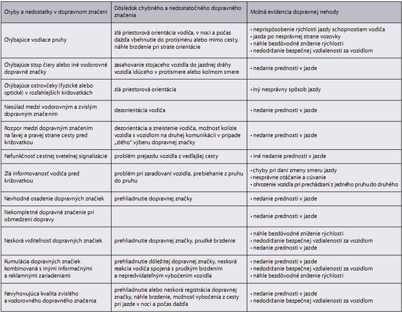 Nedostatky v dopravnom značení možno považovať za jedny z prvotných príčin vzniku dopravnej nehody. Nikdy nefigurujú ako príčina dopravnej nehody v evidencii dopravnej polície, ale v mnohých prípadoch sú za dopravnou nehodou skryté. V policajnej štatistike ich nájdeme za kolónkami nesprávny spôsob jazdy, porušenie základných povinností, nedanie prednosti v jazde alebo nesprávne predbiehanie. Vplyv zlého dopravného značenia na reakciu vodiča a možná následná dopravná nehoda podľa posúdenia dopravnej polície je uvedená v tabuľke.