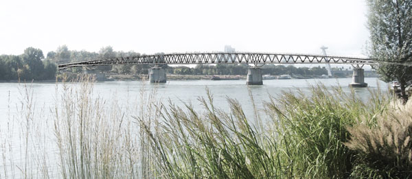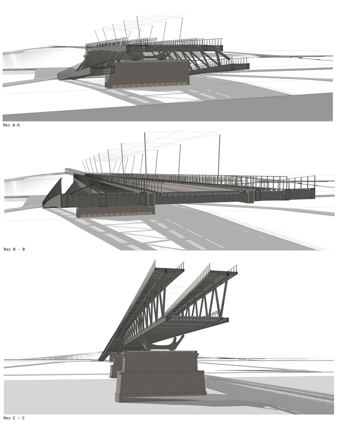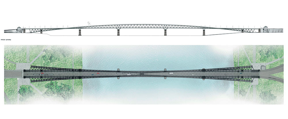 Oceľová konštrukcia je na riešenom mieste dokonale zažitá a tento typ je vhodný z hľadiska zaťaženia kamenných pilierov, ktoré vo svojom návrhu ponechávam. Figúra vytvorená z priehradovej oceľovej konštrukcie mení svoju výšku v závislosti od kompozično-prevádzkových parametrov. V istom mieste funguje ako prostý nosník. Konštrukcia na svoje miesta uloženia reaguje zmenami rytmu diagonál, ktoré sú čitateľné z bočných pohľadov. Tým zároveň parafrázuje pôvodné členenie oboch starých mostov. Úroveň spodnej mostovky je oproti pôvodnej nivelete zdvihnutá, aby sa zväčšil plavebný gabarit. Nová konštrukcia dosadá na oceľové vidlice a až prostredníctvom nich na pôvodné kamenné piliere. Uloženie na vidlice je zámerné, jasne identifikujú obdobie pôvodu. Zároveň som sa týmto spôsobom pokúsil vytvoriť citlivé spojenie novej konštrukcie a starých podpier. Kompozícia je tvorená dvoma oblúkmi, ktoré sa akoby pretínajú vo dvoch bodoch. Spodný oblúk má vzopätie 2 m. Druhý oblúk, ktorý sa javí v pohľade od hladiny Dunaja tiež jednoducho, je zložitejšieho charakteru a s väčším vzopätím prekonáva výšku približne 14 m. Začína 5 m pod úrovňou mostovky na začiatku kompozície a pokračuje až po vyvýšenie nad spodný oblúk, asi 6 m v strede, kde sa oblúky z oboch strán mosta spájajú do krčka. Toto miesto vytvára najcennejšiu plochu z hľadiska výhľadu na obe nábrežia a ostatné dominanty mesta.