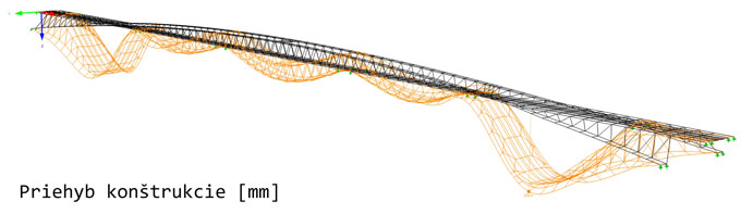 Konštrukciu mosta autor konzultoval s Ing. Tomášom Živnerom, PhD. z Katedry kovových a drevených konštrukcií SvF STU. Priehradový spojitý trámový most so spodnou ortotropnou mostovkou v troch stredných poliach tvorí trojuholníkovú sústavu bez podružných zvislíc. V strednom poli je priečny rez uzatvorený priehradovým stužením. Pás krajných polí je kotvený do základového bloku, mimo­úrovňovo vzhľadom na mostovku. Konštrukčná výška od spodnej hrany dolného profilu po vrchnú hranu horného profilu je 7 650 mm. Celková dĺžka mosta je 459 590 mm.“