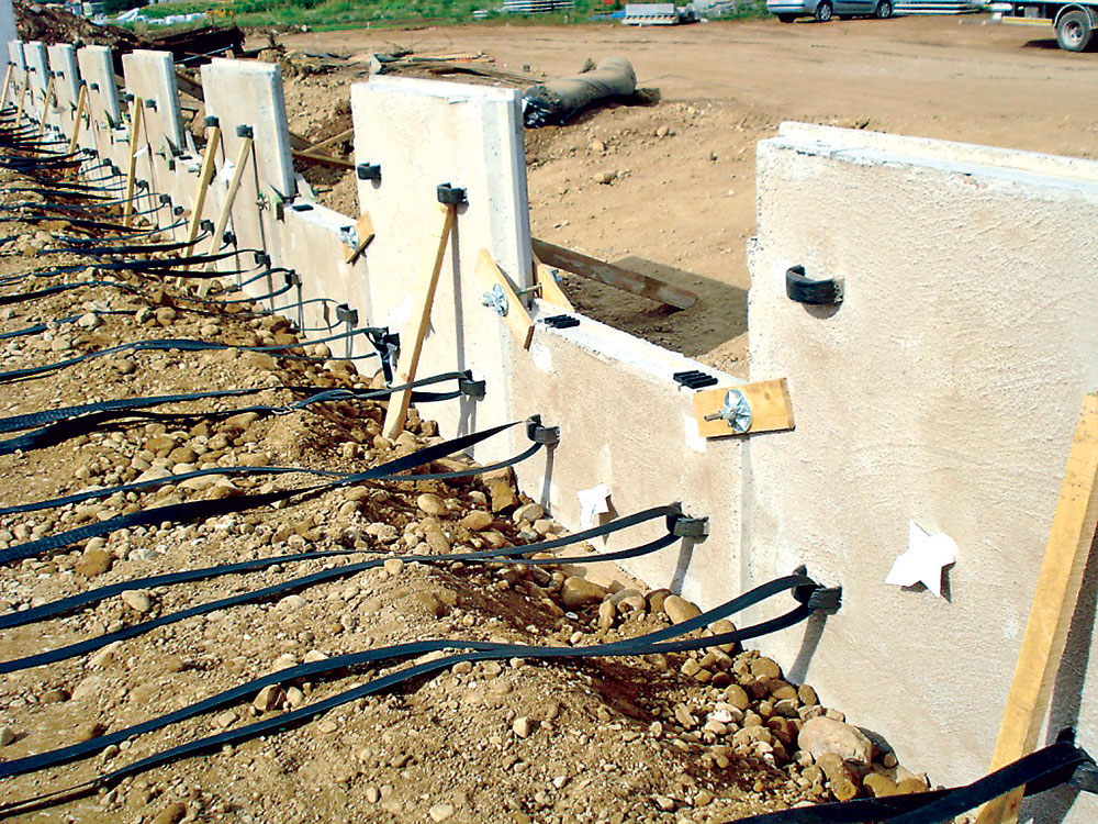 Prefabrikované panely majú pri výrobe na rubovej strane osadené spojovacie prvky v počte a umiestnení závislom od konkrétneho projektového návrhu. Spojovacie prvky sú vyrobené na báze polyméru. Spoj medzi lícovými panelmi a výstužou je vytvorený prevlečením geopásov cez úchyty (obr. 4). Počet úchytov pri jednotlivých výškach je spolu s typom a dĺžkou geosyntetickej výstuže veľmi dôležitým prvkom správneho fungovania celej konštrukcie.