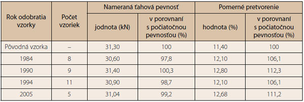 Porovnanie jednotlivých parametrov ťahovej pevnosti a pomerného pretvorenia je uvedené v tabuľke. Ako je z nej zrejmé, mechanické vlastnosti geopásov ostali aj napriek veku 30 rokov zachované. Skúška potvrdzuje výborné vlastnosti geopásov z polyesterových vláken obalených v polyetyléne, ktoré sa týkajú ich odolnosti proti chemizmu prostredia a porušeniu pri inštalácii.