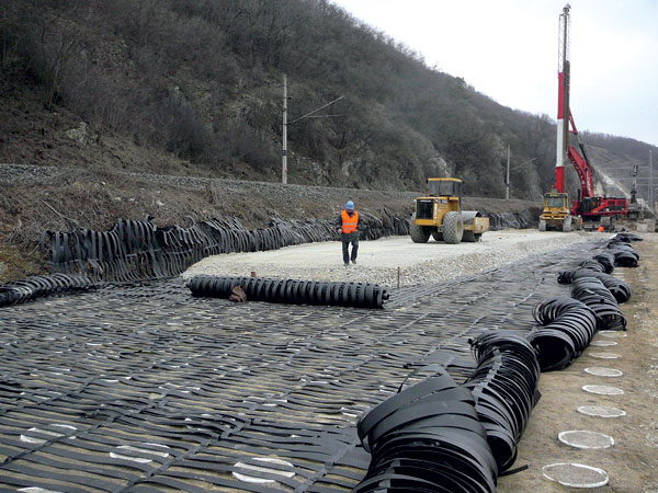 Geomreža (GGR) je plošný, ohybný, tuhý alebo polotuhý prvok vyrobený zo vzájomne sa ortogonálne križujúcich ťahových prvkov vytvárajúcich pravidelnú štruktúru. Otvory plošného prvku sú väčšie ako 50 % z celkovej plochy. Ťahové prvky sa spájajú tkaním, pletením, tepelným spojením s následným napínaním alebo napínaním extrudovanej membrány. Hlavná funkcia geomreže v horninovej konštrukcii je výstužová, to znamená, že sa geosyntetická výstuž využíva na prenos ťahových a/alebo šmykových síl na zvýšenie stability a únosnosti konštrukcie. Geomreža slúži na vystuženie horninových konštrukcií dopravného staviteľstva, zakladanie násypov na pilótach (obr. 2), zvýšenie únosnosti podložia, vystuženie strmých svahov a asfaltových vrstiev.