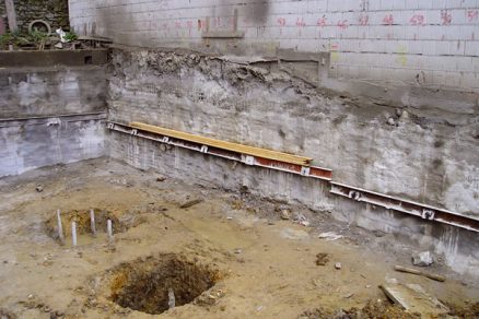 Ak je novostavba odsadená od staršej nepodpivničenej budovy viac ako 2 m a predpokladané dno relatívne plytkého výkopu bude aspoň 0,5 m nad hladinou podzemnej vody, je najjednoduchšie vytvoriť výkop so sklonom svahov maximálne v pomere 1 : 2. Na základy umiestnené menej ako 2 m od staršej budovy (čo je častejší prípad) sa už nesmie vyhĺbiť stavebná jama alebo ryha na celú dĺžku. V jednoduchých prípadoch sa postupuje po úsekoch. Statickým výpočtom treba preukázať zachovanie podmienok únosnosti podložia pod starším objektom pri obnažovaní. Z toho potom vyplýva stanovenie maximálnej hĺbky výkopu, pri ktorej ešte nie sú potrebné urobiť dodatočné ochranné opatrenia. Oveľa častejšie sa stretávame s novostavbou, ktorá tesne prilieha k existujúcej budove. Okrem dostatočne tuhej pažiacej konštrukcie zabraňujúcej deformáciám vo vodorovnom smere je spoľahlivý návrh zvyčajne podmienený podchytením jestvujúcich základov, teda prenesením zaťaženia pod úroveň dna výkopu.