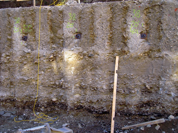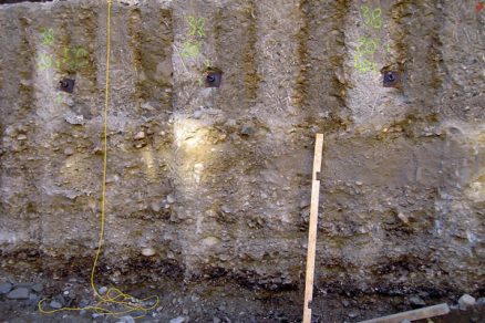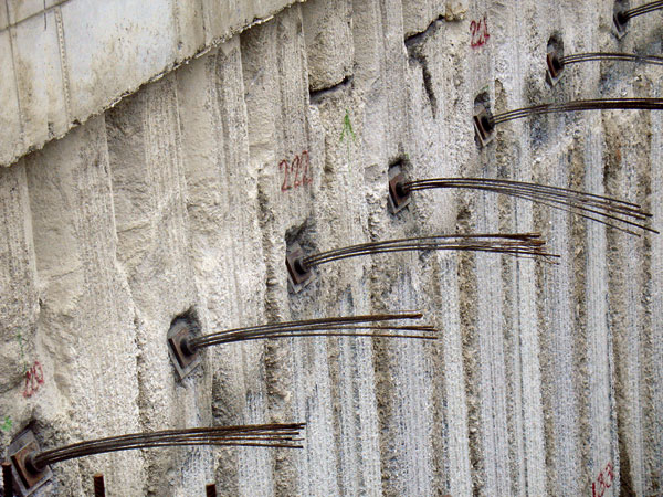 V hutnej sypkej zemine alebo súdržnej zemine tuhej až pevnej konzistencie nad hladinou podzemnej vody sa na zabezpečenie stavebnej jamy zhotovuje pažiaca stena z mikropilót. Vhodná je najmä v stiesnených podmienkach pri hĺbení výkopu do hĺbky menšej ako 5 m. Vzdialenosť medzi mikropilótami je zvyčajne asi 0,3 m. Horizontálne účinky sa zachytávajú injektovanými kotvami, ktorých korene sa musia nachádzať až za oblasťou možného splastizovania zemného klinu. Na obr. 1 až 3 sú zachytené dôležité fázy zhotovenia mikropi­lótovej steny kotvenej na rôznych stavbách.