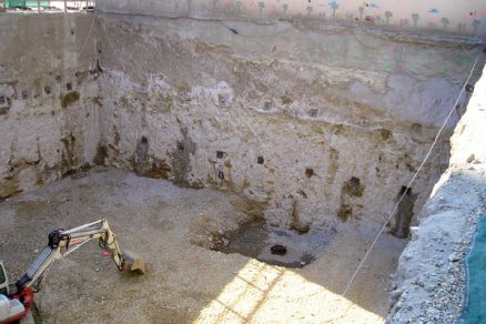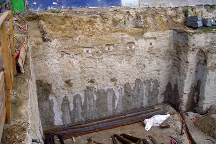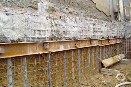 Obr. 5 a 6: Ukážka podchytenia budovy a zároveň paženia stavebnej jamy kotvenou stenou zhotovenou prúdovou injektážou na dvoch odlišných stavbách