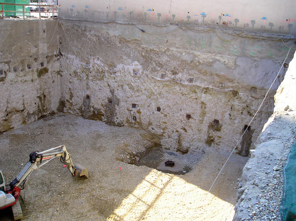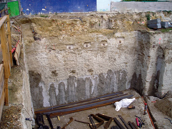 V ostatných rokoch sa pri zakladaní v stiesnených podmienkach úspešne začala uplatňovať prúdová injektáž. Výhodou prúdovej injektáže je jediná pracovná operácia, keď sa podľa potreby piliere prúdovej injektáže umiestnia v jednom alebo vo dvoch radoch a kotvia v niekoľkých výškových úrovniach podľa požiadavky statického výpočtu. Takto vytvorená stena paží výkop stavebnej jamy a chráni ho zároveň aj pred prítokom podzemnej vody a podľa potreby aj podchytáva základy existujúcich budov a prenáša z nich zaťaženie do väčšej hĺbky. Príklad použitia prúdovej injektáže na podchytenie základov a súčasne paženie stavebnej jamy je na obr. 5 a 6. Urobí sa tak úplne čistý výkop bez akýchkoľvek prekážok.