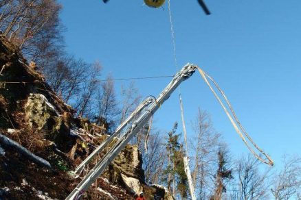 Obr. 2: Osadenie stĺpov bariéry MACCAFERRI RMC300/A výšky 5m za pomoci leteckej techniky