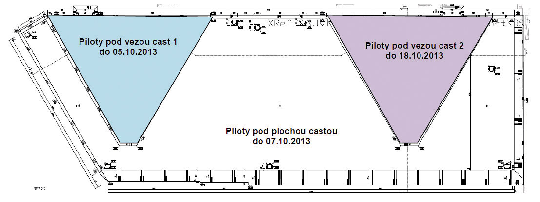 Samotná príprava realizácie vrátane výroby armokošov, ako aj mobilizácia technológie prebehli v extrémne krátkom čase. Pilóty sa na stavbe začali realizovať od 18. septembra 2013 prvou vrtnou súpravou BAUER BG28, čo bolo iba osem kalendárnych dní od objednávky diela zo strany generálneho dodávateľa. Následne sa 21. septembra 2013 začala realizácia vrtných prác aj druhou vrtnou súpravou BAUER BG40, ktorá pracovala od prvého dňa v dvojzmennej nepretržitej prevádzke tak, aby sa mohli splniť míľniky v rámci jednotlivých etáp diela a aby sa dodržal konečný termín 18. októbra 2013. Čas na realizáciu diela zahŕňajúceho 370 pilót s celkovou dĺžkou 6 200 m tak bol nakoniec skutočne len jeden mesiac (postup prác a nasadenie vrtných súprav vidieť na obr. 2 a 3). Všetky termíny stanovené objednávateľom diela aj investorom sa dodržali, pričom konečný termín ukončenia pilotáže sa dokonca podarilo skrátiť z pôvodného dátumu 18. 10. 2013 o osem kalendárnych dní – posledná pilóta sa zrealizovala 10. 10. 2013.Pri šírke stavebnej jamy približne iba 45 m (obr. 4) bolo dôležité skoordinovať logistiku dodávky materiálov (armokoše, betón), ako aj kontinuálny odvoz vývrtku na medziskládku v rámci staveniska. Každá vrtná súprava bola obsluhovaná betónovými pumpami na pásových podvozkoch, ktoré sa dopĺňali z autodomiešavačov. Vzhľadom na zvolenú technológiu CFA pilót bolo nevyhnutné mať na stavbe pred začiatkom betonáže každej pilóty pri každej vrtnej súprave dostatočný počet plných betónových domiešavačov (pri pilótach s dĺžkou nad 20,0 m to boli štyri domiešavače na jednu súpravu), aby sa betonáž neprerušila. Na druhej strane, vozidlá nesmeli stáť na stavbe príliš dlho, aby sa neprekročil dovolený čas spracovateľnosti betónu. Kvalita betónu z hľadiska jeho spracovateľnosti a stability počas celkového času vykládky (najmä schopnosť udržať množstvo vody aj pri tlaku betónového stĺpca v hĺbke 25,0 m) zohrávala kľúčovú úlohu pri následnom zabudovávaní armokošov s dĺžkou až 16,0 m do zabetónovanej pilóty. Ak by betón vo väčších hĺbkach vplyvom veľkého tlaku čerstvej betónovej zmesi v pilóte príliš rýchlo strácal vodu, výrazne by sa zmenila jeho konzistencia a ohrozila možnosť bezproblémového zabudovania armokošov.