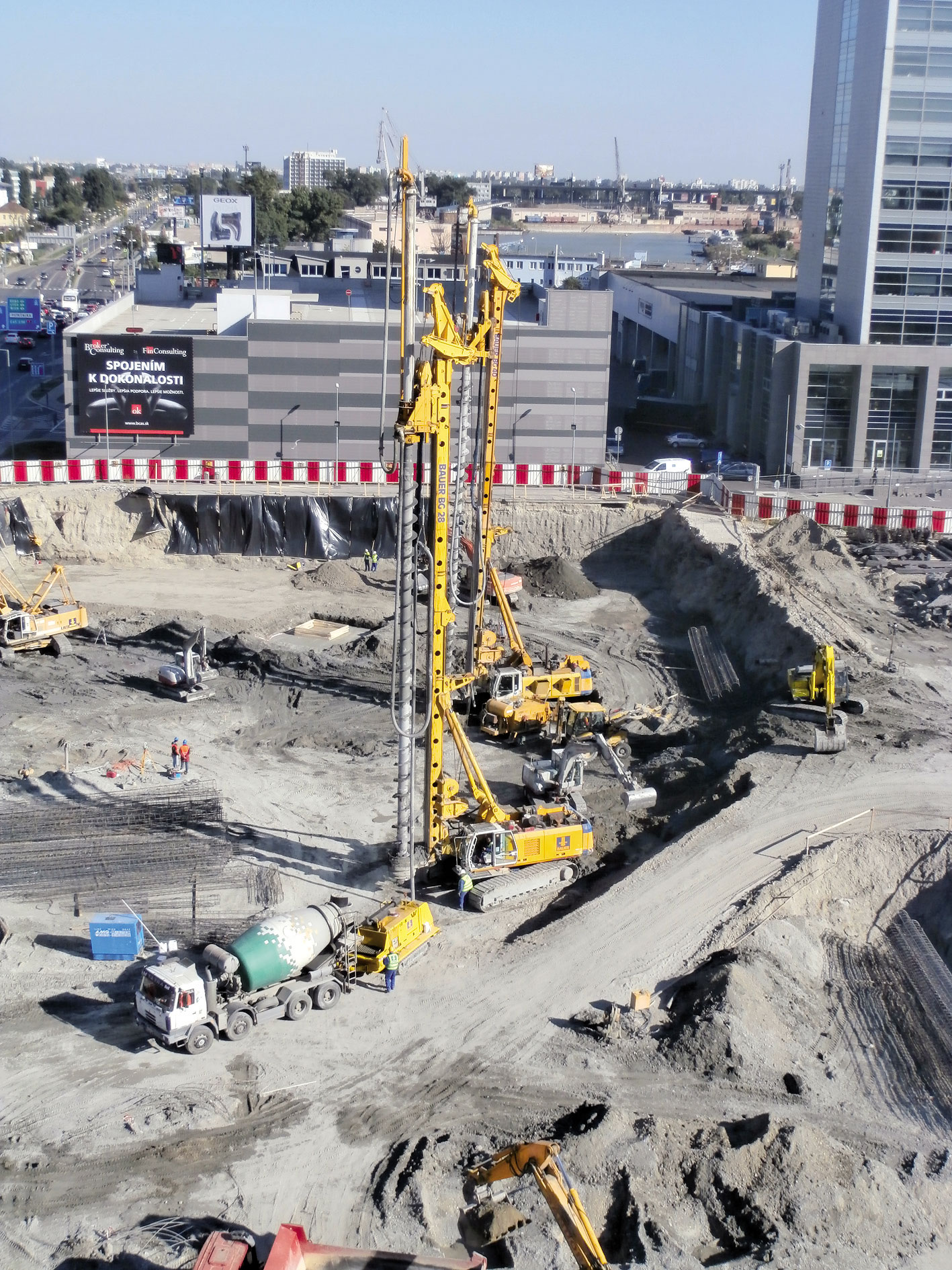Časť pilóty prebetónovaná nad finálnu hornú hranu sa pred realizáciou podkladových betónov odbúra. V rámci realizácie bolo treba riešiť ešte menší problém so štandardnými vrtákmi na technológiu CFA. Tie totiž dosahujú dĺžku asi 16,0 až 18,0 m a z toho dôvodu by sa nedali vyvŕtať pilóty s priemerom 880 mm až do hĺbky 25,0 m v zmysle realizačného projektu. Riešenie sme našli v predĺžení formou Kellyho tyče s dĺžkou 6,0 m, resp. 8,0 m v hornej časti vrtákov. Vzniklo tak vrtné náradie s priemerom 880 mm s celkovou dĺžkou 26,0 m, vďaka ktorému sa dosiahla projektovaná hĺbka pilót. Aby sa pri tejto dimenzii vrtného náradia podarilo prekonať plášťové trenie pôsobiace na vrták počas vŕtania v hĺbke 25,0 m, bolo potrebné nasadiť našu najsilnejšiu vrtnú súpravu v regióne BAUER BG40, ktorá má v tejto konfigurácii prevádzkovú hmotnosť približne 120 t. Ako druhú vrtnú súpravu na všetky pilóty s priemerom 630 mm a na pilóty s priemerom 880 mm do hĺbky 22,0 m sme nasadili upravenú vrtnú súpravu BAUER BG28, rovnako s predĺžením vrtákov pomocou Kellyho tyče a s prevádzkovou hmotnosťou približne 105 t. Vzhľadom na vysokú hmotnosť vrtnej súpravy BAUER BG40 nám v tom čase nebol povolený nadrozmerný transport cez Prístavný most v Bratislave. Aby sme dodržali extrémne krátky čas na realizáciu diela, museli sme pristúpiť k neštandardnému odľahčeniu vrtnej súpravy demontážou pásového podvozka s hmotnosťou približne 16 t (každý pás má hmotnosť asi 8 t) a protizávaží s hmotnosťou približne 21 t.