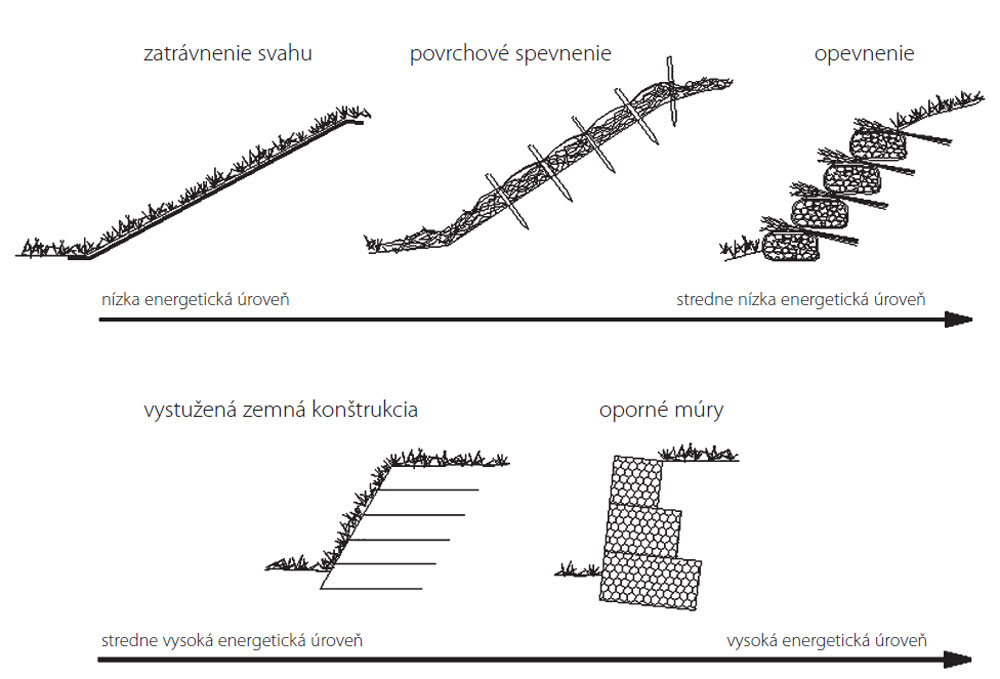 Skutočnou výzvou je spojiť to najlepšie z oboch typov materiálov tak, aby bolo možné predpovedať, ako sa novovytvorené prostredie bude správať a ako časom zlepší stabilitu brehu. Najvhodnejším riešením je stanoviť minimálnu energetickú úroveň, ktorá je všeobecne definovaná ako minimálne množstvo zásahov do životného prostredia, nevyhnutných na vyriešenie problému (AIPIN 1997). Na obr. 1 sa energetická úroveň pohybuje od najnižšej bez zásahu až po najvyššiu, čo môže predstavovať masívnu gravitačnú konštrukciu.