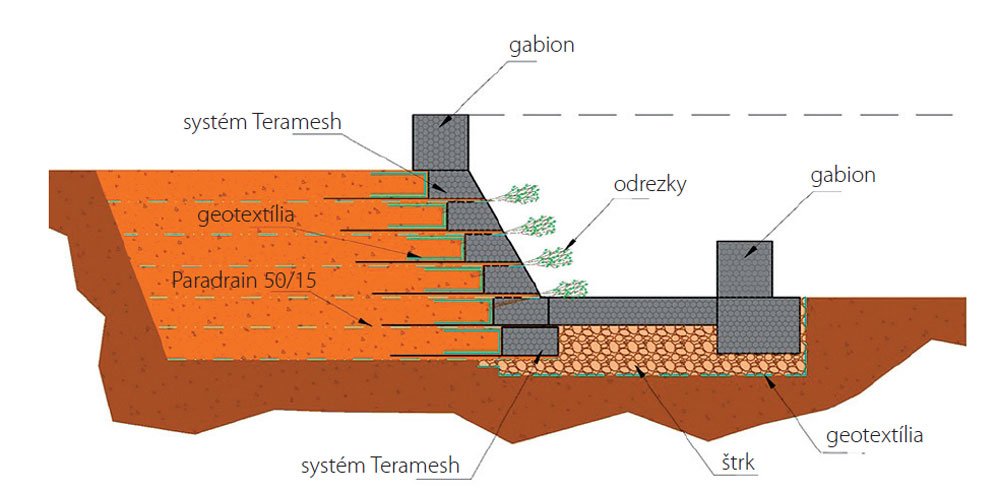 - horné prvky systému Terramesh sa upravili na lichobežníkový tvar. Živé vŕbové odrezky sa umiestňovali medzi lícové prvky vo vzdialenosti 15 cm od seba. Koše sa vyplnili kameňom a následne ornicou. Množstvo ornice predstavovalo maximálne 30 až 35 % objemu lichobežníkového koša. Ornica mala dve funkcie – vytvoriť vhodnú pôdu na koreňový systém a udržiavať vyššiu vlhkosť v gabionom koši. Odrezky boli dlhé najmenej 1,2 m. Počas prvého roka sa konštrukcia zavlažovala.