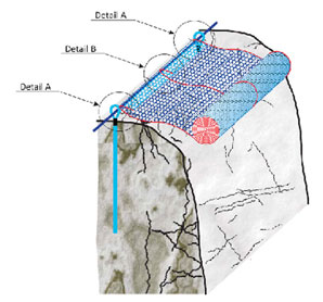 Systém sietí je po obvode upevnený lanami s priemerom 12 mm, ktoré sú miestne upevnené lanovými kotvami alebo zemnými klincami. Aby sa zabránilo vyplavovaniu zvetraných častíc bridlíc cez oká sietí, umiestni sa pod siete protierózna georohož. Klince uchytávajúce siete sa budú predpínať na silu 30 kN momentovým kľúčom.
