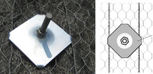 Systémová platňa (obr. 7) je vysokopevnostný prvok s klenutým otvorom v strede a zahnutými rohmi na čo najlepšie prichytenie lán geokompozitu Steelgrid HR a najlepšiu smerovú variabilitu kotviacich prvkov. Rozmery platne sú 250 × 250 mm, priemer otvoru je 37 mm, hrúbka platne 8,0 mm. Trieda ocele je S235LRG2, galvanizovaná žiarovo podľa EN ISO 1461-2, s množstvom zinku najmenej 500 g/m2.