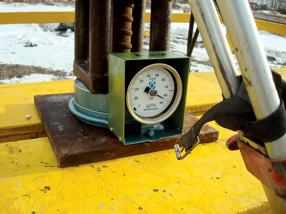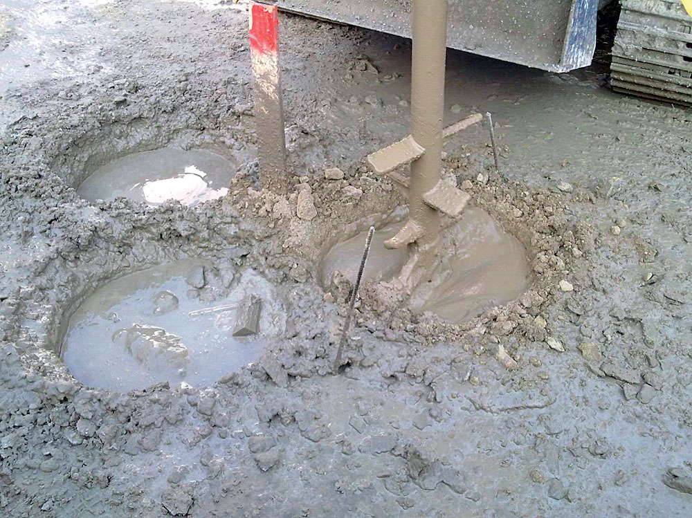 - vrtná súprava (obr. 6) pomocou špeciálneho vrtného sútyčia s pádlami zavŕta do zeminy nástroj s priemerom budúceho stĺpa DSM, súčasne dochádza k prítlaku a tlakovému injektovaniu tekutej cementovej suspenzie, zemina pri tom eroduje a premiešava sa od hlavy smerom k päte;