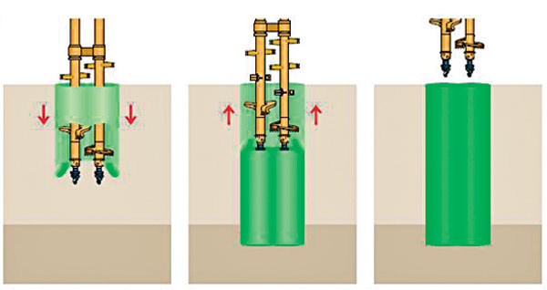 | Obr. 4 Zhotovovanie stĺpov DSM | Obr. 5 Schéma zhotovovania Deep Soil Mixingu |