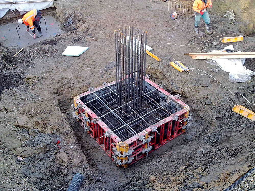 Ako vhodná metóda sa navrhol systém založenia objektu na stĺpoch Deep Soil Mixing (DSM). Dodávateľ stavby v spolupráci s firmou špeciálneho zakladania preprojektovali pôvodne navrhnuté základy na základovú dosku s hrúbkou 350 mm s nábehmi pod stĺpmi s hrúbkou 900 mm tak, aby sa základová škára nachádzala nad hladinou podzemnej vody a nebolo potrebné tesnenie stavebnej jamy a čerpanie podzemnej vody (obr. 3).