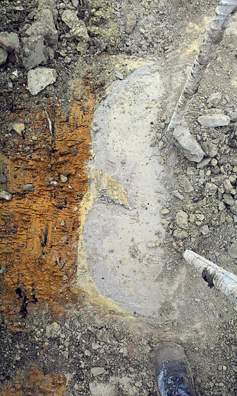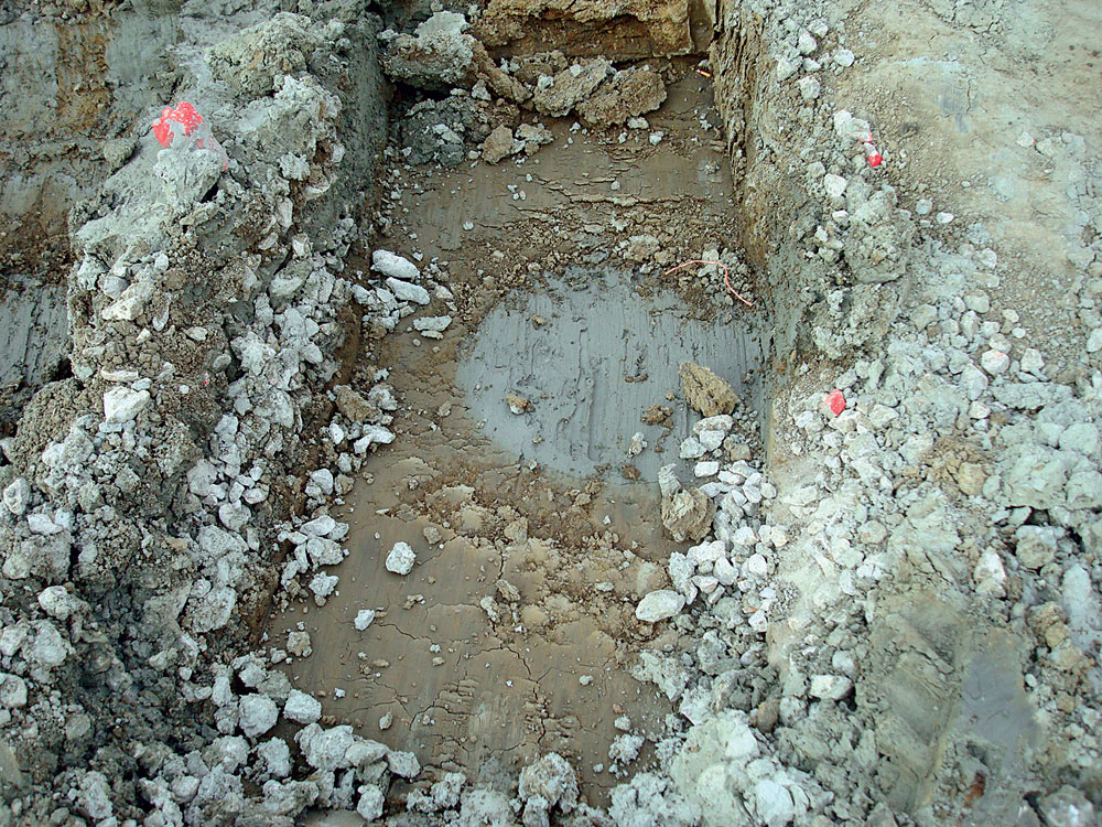 - po odkopaní pomocou rýpadla s hladkou lyžicou (nesmie sa použiť lyžica so zubami) na základovú škáru (obr. 10 a 11) sa hlavy DSM stĺpov musia skontrolovať vizuálne (ich kvalita, množstvo a poloha). V prípade výrazných polohových odchýlok (nad 20 cm) treba informovať projektanta. Porealizačné geodetické zameranie nie je potrebné.