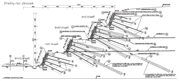 Zárez je navrhnutý terasovite, s konštantnou výškou stupňov (4 m). Sklon líca stupňov je 2,5 : 1. Medzi jednotlivými stupňami sa navrhli lavičky so sklonom 3 %. Šírka vrchnej lavičky je 4 m, zostávajúcich dvoch 6 m. Každý stupeň zabezpečujú trvalé zemné klince. Klince, ktoré sa použili na zabezpečenie stupňov, sú dvojaké: