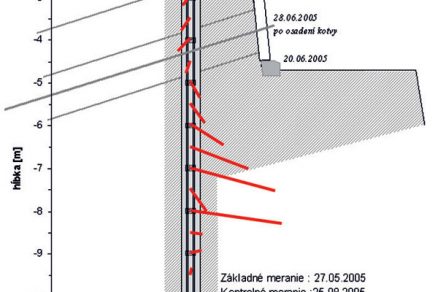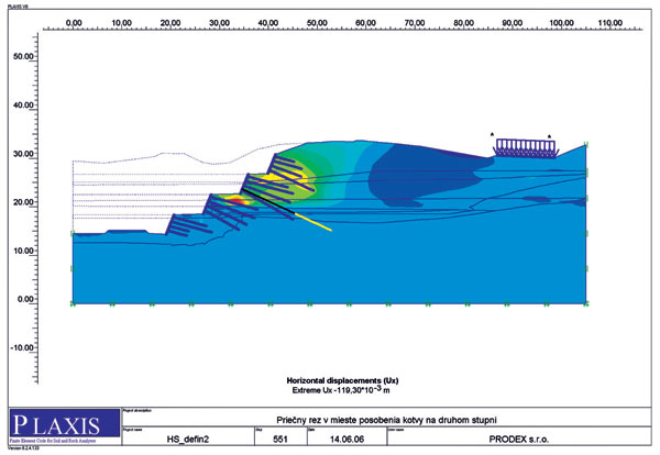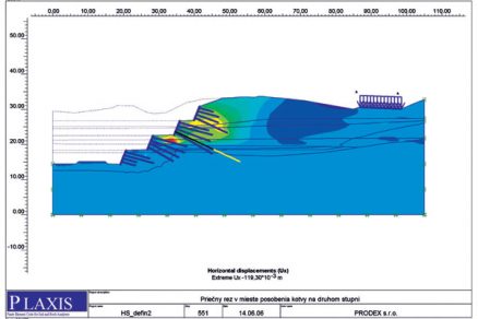 Maximálne horizontálne deformácie zistené výpočtom dosahujú hodnotu 13,2 cm na rozhraní spodnej rašelinovej vrstvy a ílov strednej plasticity. Tieto deformácie zohľadňujú stavebné postupy, ako sú etapový odkop stupňov, realizáciu klincov so striekaným betónom a postupné aktivovanie zemných kotiev.