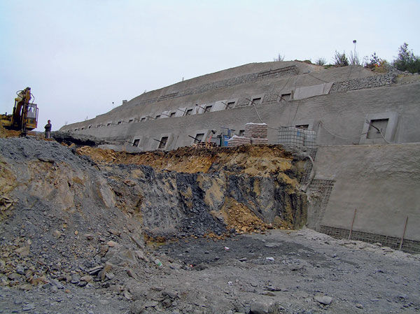 Hlavy klincov sú oceľovou platňou prichytené o rubovú výstuž striekaného betónu. Výstuž osadená v rube striekaného betónu je zo zváraných sietí, ktorých prúty majú priemer 8 mm v pozdĺžnom aj priečnom smere. Vzdialenosť priečnych prútov je 100 mm, vzdialenosť pozdĺžnych prútov 150 mm. Výstuž nachádzajúcu sa pri hornom povrchu striekaného betónu tiež tvoria zvárané siete (prúty s Ø 6 mm). Priečna a pozdĺžna vzdialenosť prútov sietí v líci je 150 mm. Väčšie ohybové momenty v spodných častiach striekaného betónu vykryla dvojica zváraných sietí obrátených do seba. Pri spodných radoch klincov, na druhom a treťom stupni, sa pre šmykové sily navrhol väčší počet spôn. Hrúbka striekaného betónu je na všetkých stupňoch 0,2 m. Vonkajšia stabilita zárubných múrov a oporného múru je zabezpečená pomocou trvalých lanových kotiev. Kotvy na druhom stupni sa zrealizovali v štvormetrových vzdialenostiach a sú predopnuté na silu 400 kN. Dĺžka kotiev je 27,6 m. Kotvy na treťom stupni sú v osovej vzdialenosti 6 m. Predpínacia sila kotiev bola 600 kN (dĺžka 19,6 m). Predpínacie laná všetkých kotiev sú šesťpramencové. Korene kotiev majú jednotnú dĺžku – 9,5 m. Kotevné sily sa na stupne prenášajú cez roznášacie železobetónové dosky tvaru štvorca so stranou s dĺžkou 2 m a hrúbkou 0,6 m.