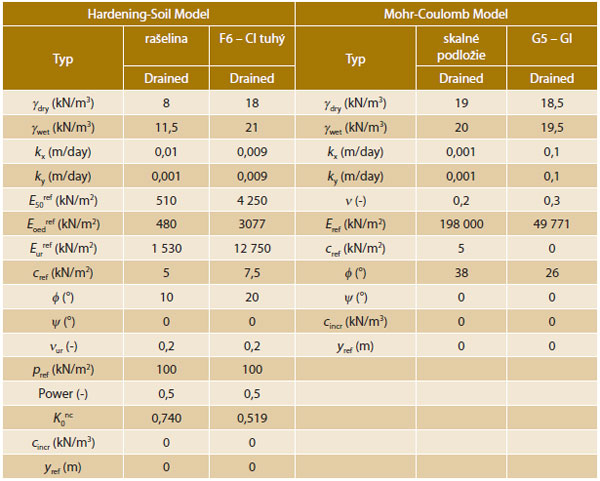 Prvý výpočet zárezu sa v rámci dokumentácie realizoval pomocou výpočtového modelu Mohr-Coulomb Model (MC). Je všeobecne známe, že MC model sa používa na prvotný návrh a na získanie približného správania sa zemín a skalných hornín v interakcii so železobetónovými konštrukciami. Na základe takto získaných výsledkov sme pristúpili k riešeniu zárezu modelom Hardening-Soil Model (HS), ktorý nám umožňuje zohľadniť narastanie tuhosti zeminy so zvyšujúcim tlakom. Porovnaním výsledkov oboch modelov možno konštatovať, že HS model je vhodnejšie použiť pri navrhovaní prác s hlbokými výkopmi alebo s odťažovaním veľkej mocnosti nadložia. HS model dáva reálnejšie hodnoty horizontálnych a vertikálnych deformácii konštrukcie aj zemného telesa. Výpočet bol rozdelený na trinásť fáz, z čoho prvé dve fázy sú určené na stanovenie počiatočného stavu napätosti, štyri fázy tvoria výpočet stability a zostávajúcich sedem fáz sú stavebné postupy. Na stanovenie počiatočného napätostného stavu sa použila metóda Gravity Loading.