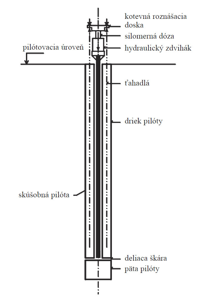 Zaťažovacie skúšky metódou delenej pilóty sa vykonávajú vzopretím drieku proti päte pilóty. Zaťažovacia sústava pozostáva z dvoch základných častí (obr. 1) – zo špeciálnej výstuže zabudovanej do skúšobnej pilóty a z inventárnej časti zaťažovacej sústavy. Špeciálna výstuž je osadená v skúšobnej pilóte, pričom ju rozdeľuje na dve časti: na pätu a driek. Súčasťou špeciálnej výstuže je rúra, ktorá vytvára priechodný otvor v drieku pilóty a umožňuje prenos zaťaženia na pätu. Zaťaženie pilóty sa vytvára pomocou hydraulického zdviháka osadeného na vzpere, ktorá je posuvne uložená v stredovej rúre a dosadá na deliacu dosku päty pilóty. Súčasne s tlakom na pätu pilóty sa pri skúške vytvára tlak na kotevnú dosku prikotvenú ťahadlami, ktoré sú zabetónované v drieku pilóty. Pri tomto postupe pôsobí súčasne na pätu aj na driek pilóty rovnako veľké zaťaženie, ktoré má opačný smer. Výsledkom zaťažovacej skúšky je zaťažovacia krivka odporu na päte, zaťažovacia krivka plášťového trenia a súčtová krivka delenej pilóty.