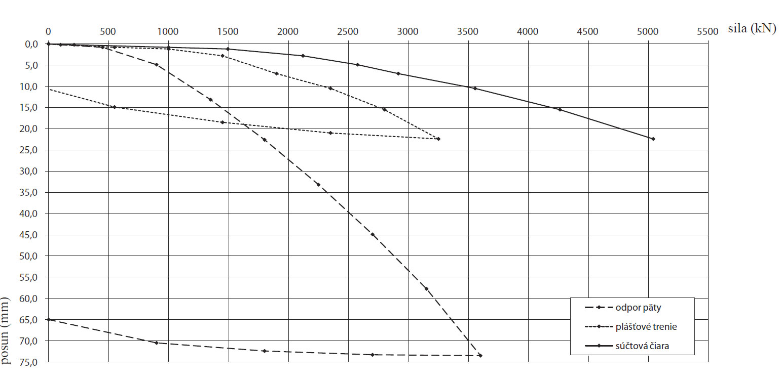 Druhým príkladom zaťažovacej skúšky delenej pilóty je skúšobná pilóta zhotovená v ílovitom piesku. Hladina podzemnej vody bola narazená v hĺbke 6 m. Nominálny priemer pilóty bol 1 200 mm, dĺžka pilóty 15,5 m. Pilóta bola zhotovená na celej dĺžke pod ochranou oceľovej pažnice. Maximálnu ustálenú silu na päte pilóty sme dosiahli pri odpore pilóty 1 800 kN a sadaní 26,7 mm, maximálnu ustálenú silu na plášti pilóty sme dosiahli pri zaťažení 1 750 kN a posune 26,8 mm. Pri vyššom zaťažení už nenastalo ustálenie posunov na plášti pilóty. Súčtová zaťažovacia krivka skúšobnej pilóty bola vytvorená súčtom poradníc zaťaženia z krivky odporu päty a z krivky plášťového trenia pri rovnakom posune. Skúškou sme stanovili medznú totálnu únosnosť pilóty na tlak Rc,u = 3 548 kN, merné plášťové trenie pri medznej únosnosti 38,7 kPa a merný odpor päty pilóty 1 141 kPa. Skúška v tomto prípade preukázala približne 36-percentný podiel únosnosti päty na celkovej únosnosti.