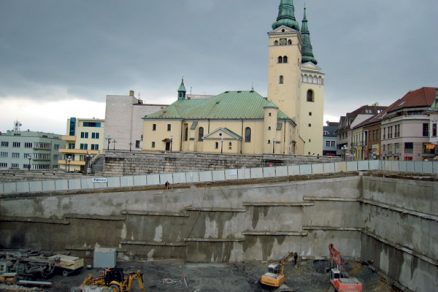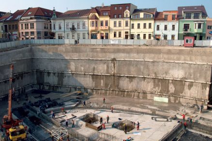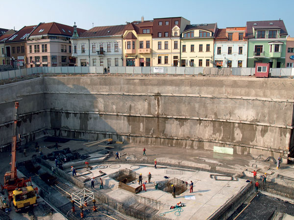 Objekt 1. etapy je založený na úrovni –17,05 m. Výška paženia od jeho hornej hrany po dno výkopu stavebnej jamy dosahuje v najhlbšom mieste úctyhodných 15,8 m. Stavebná jama nepravidelného tvaru s približnými rozmermi 60 × 80 m je ohraničená Farskými schodmi, ulicou Dolný val, garážami Kálov a domom OP Prostějov. Paženie stavebnej jamy sa vyhotovilo na všetkých stenách stavebnej jamy. Paženie tvorí dočasná kotvená pilótová podzemná stena, dočasná kotvená mikropilótová a záporová stena, ktorých konštrukčné riešenie a realizáciu opíšeme nižšie.