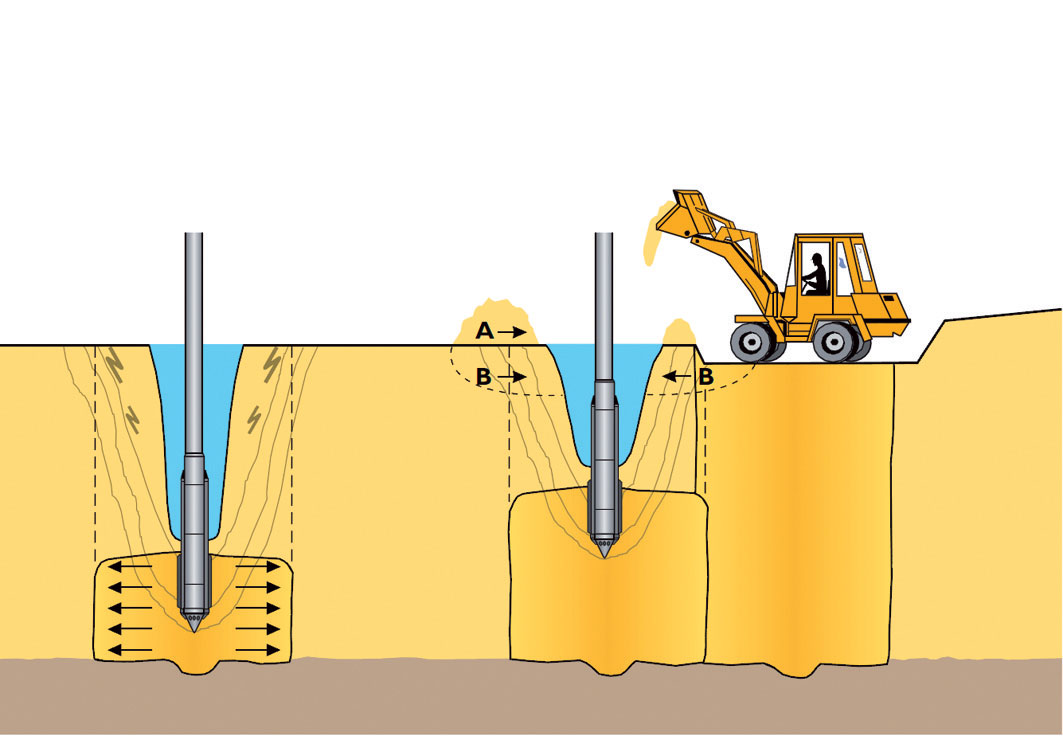 Pri veľkopriemerovom vŕtaní sa efekt zlepšovania vlastností zemín znižuje s nárastom dimenzií prvkov, ktoré sa zhotovujú počas vŕtania, pričom sa zvyšuje podiel zaťaženia, ktorý prenášajú zhotovované elementy. Vo väčšine prípadov ide o vŕtané pilóty, kde sa zemina prevažne úplne vyberá z vrtov, prípadne sa čiastočne roztláča do strán. Vzniknutý priestor sa následne vyplní čerstvou betónovou zmesou a vystuží armatúrou vo forme priestorového armokoša. Po vytvrdnutí betónu potom pilóty prenášajú osové sily, priečne sily a ohybové momenty svojou tuhosťou do únosnejších vrstiev podzákladia pomocou plášťového trenia a odporu zeminy okolo pilóty. Použitie tuhých pilótovitých prvkov má opodstatnenie pri možnosti prenosu zaťažení do výrazne únosnejších vrstiev (napríklad skalné podzákladie) v ľahko dosiahnuteľnej hĺbke, respektíve ak je nutné preniesť obrovské ohybové namáhanie. Vždy treba mať na pamäti environmentálne hľadisko, keďže výroba a doprava betónu predstavujú energeticky náročné procesy, pri ktorých sa nevyužíva miestny materiál, ale všetok sa dováža. Rovnako pri prípadnej likvidácii diela v budúcnosti je namieste očakávať výraznú záťaž životného prostredia.