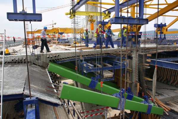 Betonárske vozíky firmy pri letmej betonáži mosta v Považskej Bystrici