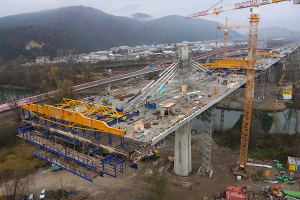 Betonárske vozíky firmy pri letmej betonáži mosta v Považskej Bystrici