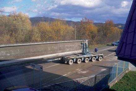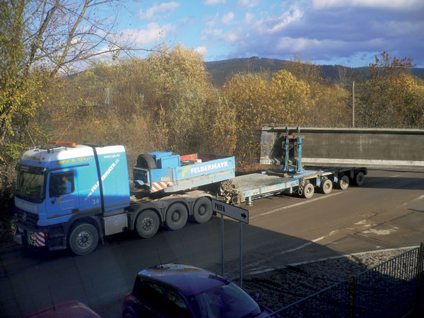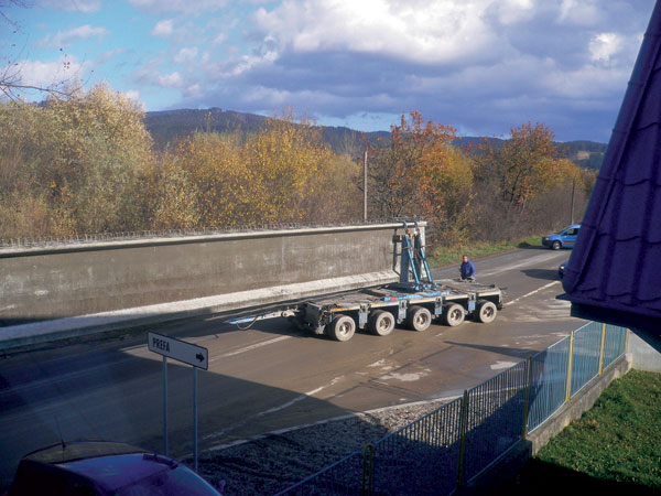Nosník sa na prepravný prostriedok naložil a zabezpečil dvoma mostovými žeriavmi s nosnosťou 40 ton vo výrobni v Hornom Hričove. Súprava sa skladala z ťahača, návesu a prívesu. Prvoidúci náves mal tuhý rám s točňou. Rám sa na ložnú plochu návesu osadil cez točňu tak, že bolo umožnené naklápanie v zvislej rovine okolo vodorovnej osi, kolmej na pozdĺžnu os návesu. Točňa ukotvená na ložnej ploche návesu zas umožňovala pootáčanie uloženého a v ráme pevne zastabilizovaného predného konca nosníka – len v rovine rovnobežnej s ložnou plochou tohto návesu. Druhý, zadný koniec nosníka sa zafixoval v ráme uloženom cez všesmerný kĺb na ložnej ploche prívesu. Nosník vykonával funkciu spojovacieho prvku medzi návesom a prívesom, ktoré boli spojené len hydraulickými hadicami a elektrickými káblami. Príves sa v minimálnych polomeroch trasy pri vychádzaní z výrobne na cestu riadil ručne cez kábel pomocou samostatne natáčaných náprav. Počas jazdy po trase s veľkými polomermi zakrivenia sa riadil bezdrôtovo. Tak sa podarilo eliminovať prekážky na trase Horný Hričov – privádzač Letisko Žilina.