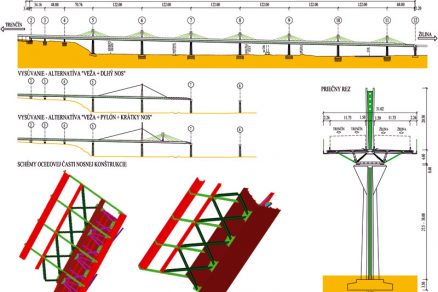 Analyzovaný bol variant spriahnutej oceľovo-betónovej nosnej konštrukcie, vysúvaný bez pomocných podpier, ale s pomocou vyvesovania konštrukcie cez montážnu vežu. Najprv sme zvažovali štandardnú kombináciu montážnej veže a dlhého výsuvného nosa. Úspornejším sa nakoniec ukázal neštandardný variant, v rámci ktorého by sa v štádiu vysúvania použil definitívny pylón so závesmi, montážna veža a krátky výsuvný nos (obr. 2).
